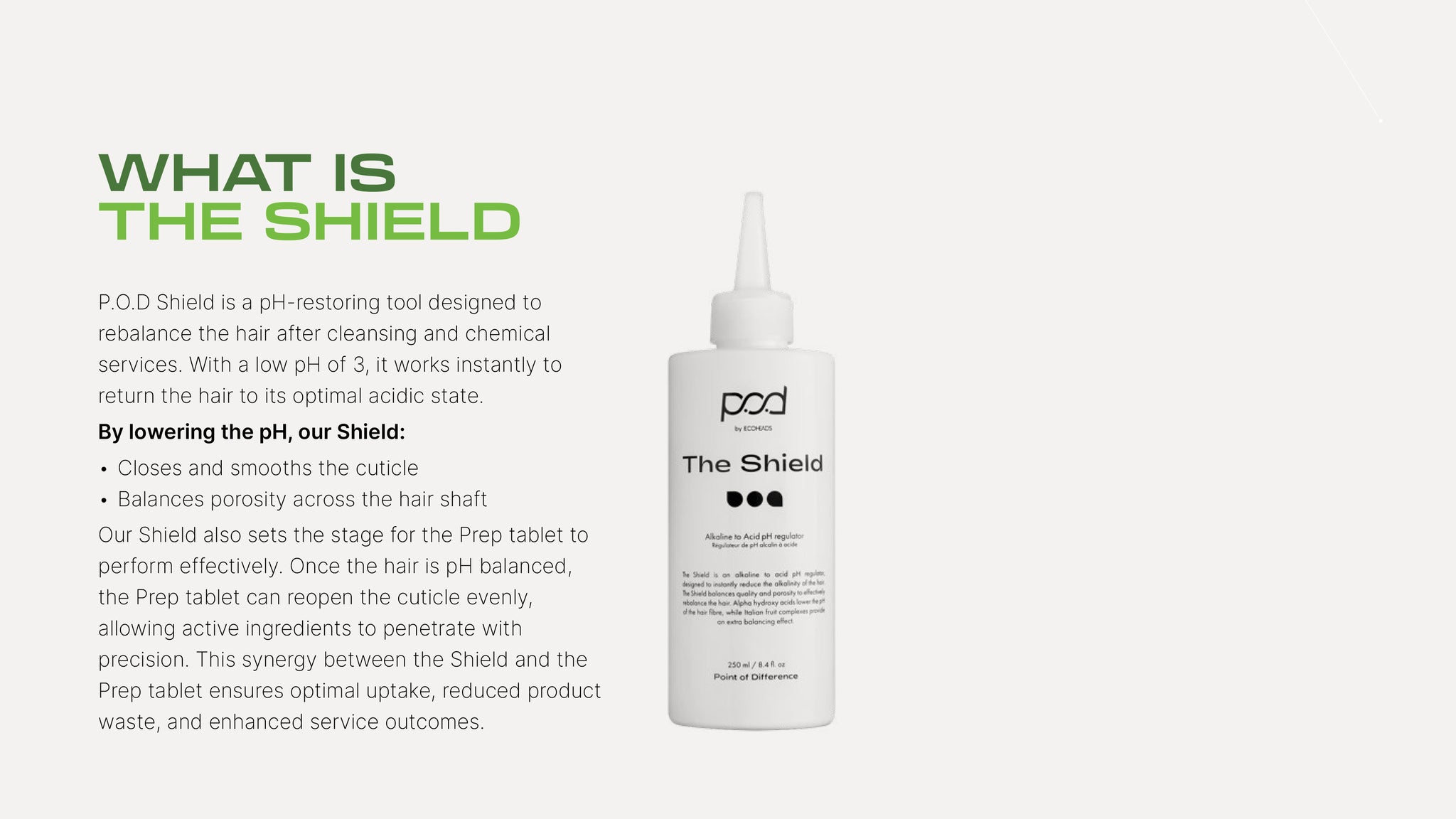 The Shield is an alkaline to acid pH regulator, designed to reduce the alkalinity of the hair. The Shield is extremely effective in reducing the pH of the hair fibre, and balancing porosity to prime the hair before any service. The Shield is instant when applied to the hair for effective pH balancing and time efficiency.